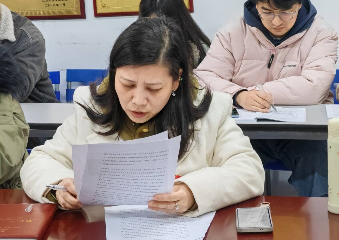 为了结合实践加深对理论知识的理解,教师党支部书记播放了2组纪录片供全体教师学习。第一部是《红巷爷俩》,通过基层老党员深入群众、贴近群众的真实事例,展现了老党员和新干部之间的密切合作。他们同心协力帮助群众、造福群众,体现了榜样的力量。第二部是《潮起荆楚——习近平总书记赴湖北考察调研纪实》,展示了当前湖北各方面的发展现状。习近平总书记指出,湖北教科人才优势突出、科技创新能力较强,要在推进科技创新和产业创新上开拓进取。作为高校工作者,要利用好本地的教育优势,为国家、为社会培养更多可堪大任的优秀法律人才。