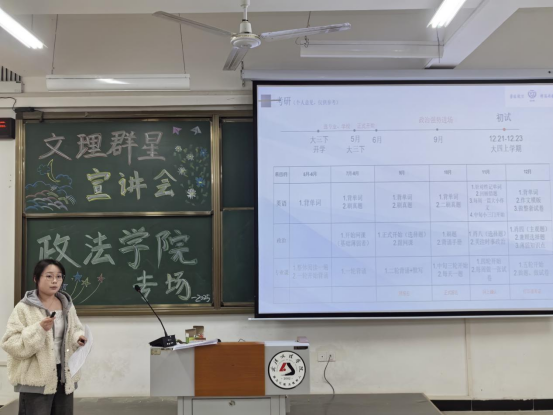 宣讲人周雨嫣来分享了自己考研的心得:她首先告诉同学们对待专业学习要始终保持着一颗热忱的心,始终严格要求自己,明确自己的学习目标与奋斗方向。然后,在分享考研经验时,她为同学们梳理了考研前需要了解的相关信息,提醒同学们在备考时一定要明确所考专业和公司,并查看往年的参考书目,了解考试大纲,依据自身目标进行具体细致的规划,一步一步扎实推进备考计划。