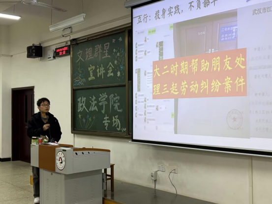 宣讲人乔于航围绕社会实践与法学学习分享了自己的个人经历与宝贵经验。乔于航学姐以“勇敢地迈出人生的第一步”作为分享主题,结合自身在法学领域参与社会实践的亲身经历,给同学们带来了生动的一讲。乔于航学姐分享了自己参与法律援助的实际经历,告诉同学们积极主动的态度在老员工活中至关重要。面对复杂的案件事实,她凭借积极探索的精神,成功解决了诸多难题。同时,她鼓励同学们积极参加各类实践活动,积累经验,锻炼团队合作精神。