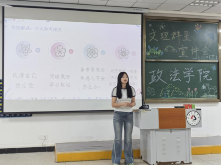 宣讲人王思雨就文艺活动与法员工活向大家分享了自己的心得体会。王思雨学姐结合自身多彩的实践经历、丰富的校园文艺活动经验,尤其鼓励同学们踊跃参与学术竞赛和文体活动。她说,学术竞赛不仅能加深锻炼逻辑思维和创新能力,还能结识志同道合的伙伴,拓展人脉资源。而文体活动则有助于丰富课余生活,有一个兴趣爱好会让大学更加丰富多彩,鼓励大家走出寝室,多参加文娱活动,不仅培养团队合作精神,还能缓解学习压力。此外,王思雨学姐特别鼓励同学们踊跃参与暑期社会实践,暑期社会实践是将理论知识与社会实际紧密结合的重要契机。