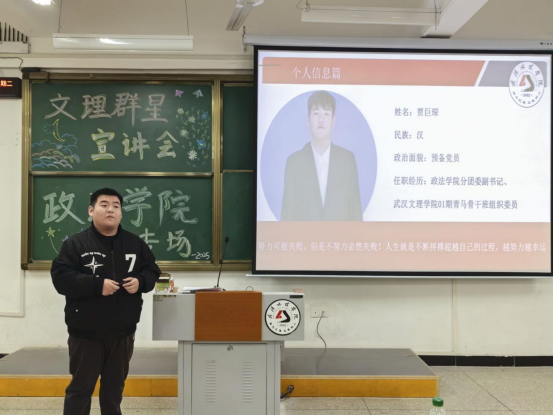 宣讲人贾巨琛进行员工干部经验分享,他就自身心得体会进行分享展示。他首先以“何为入党?”“入党的目的为何?”这两个问题为出发点向同学们展示了他自入学以来积极参加校内组织的各项活动、积极参加团学各项工作的出彩经历,鼓励同学们多多参与到校园文化活动中去,“锐意进取,勤学苦练”是他对自身学习经验的总结的八字真言,他提醒同学们平时需要多注重学习成绩,在学习上一定要有进取心,不断攀向更高处。