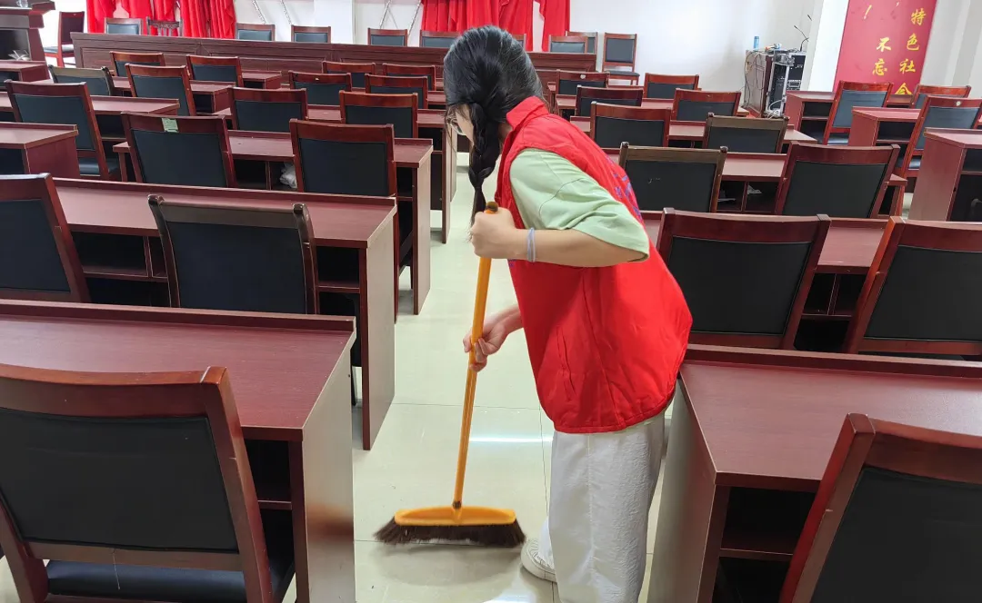 7月15日下午,志愿者们开始为第二天各教学点的开班仪式做准备,他们拿起扫把和抹布打扫教学场地的卫生,整理好桌椅板凳,张贴宣传横幅,并在各负责人的带领下对第二天的开班流程进行了彩排。