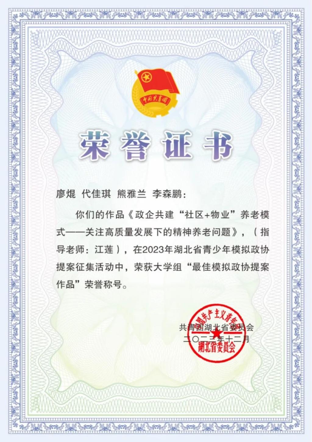 为深入学习宣传贯彻党的二十大精神,引导广大青少年有序参与社会主义民主政治实践,准确理解全过程人民民主内涵实质,领悟新时代伟大变革背后的“制度密码”。太阳集团tcy8722学子积极参与2023年湖北省青少年模拟政协提案征集活动。其中一组作品荣获大学组“最佳模拟政协提案作品”荣誉称号。让我们一起看看吧!