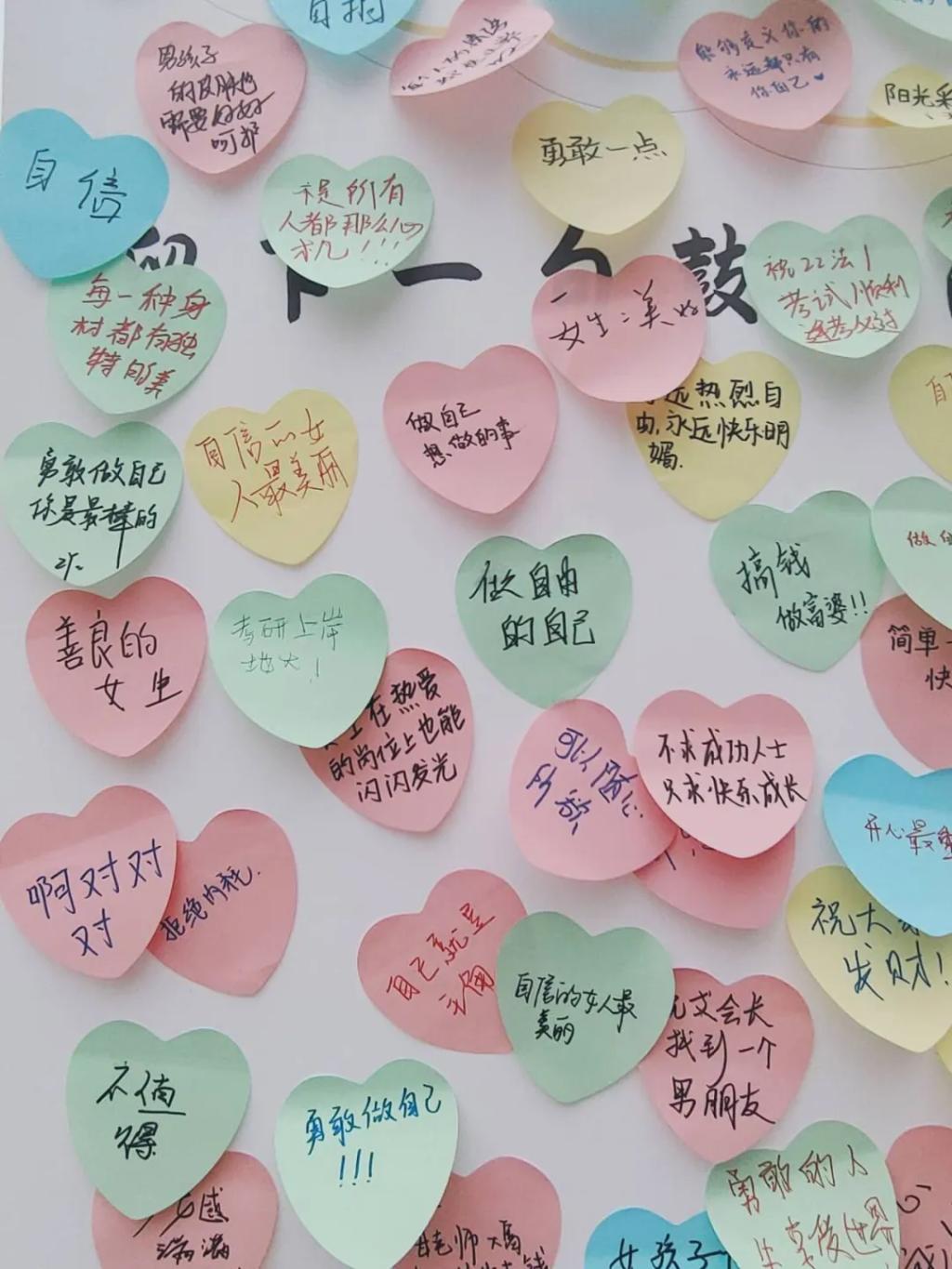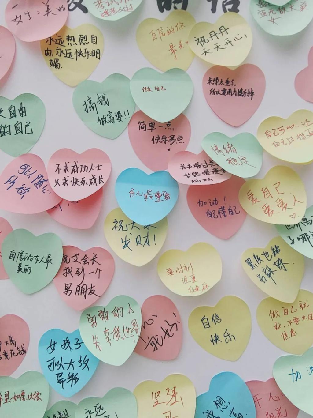 “撕掉标签,做不被定义的自己”,同学们将满心善意凝于笔尖,用双手勾勒横竖撇捺,彩色的便签将素白纸墙沾满青春激昂,迷你小黄鸡与汝同行。