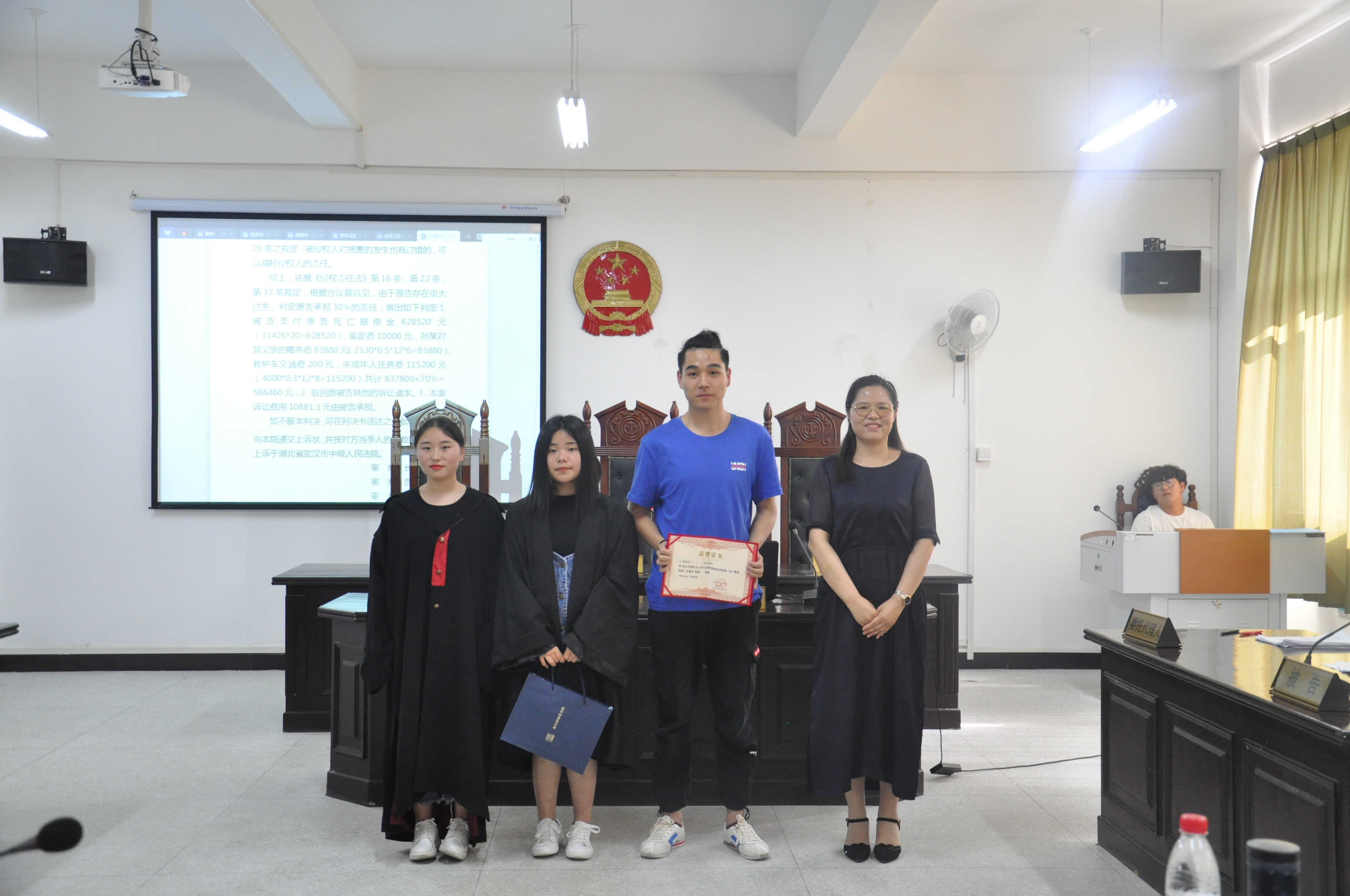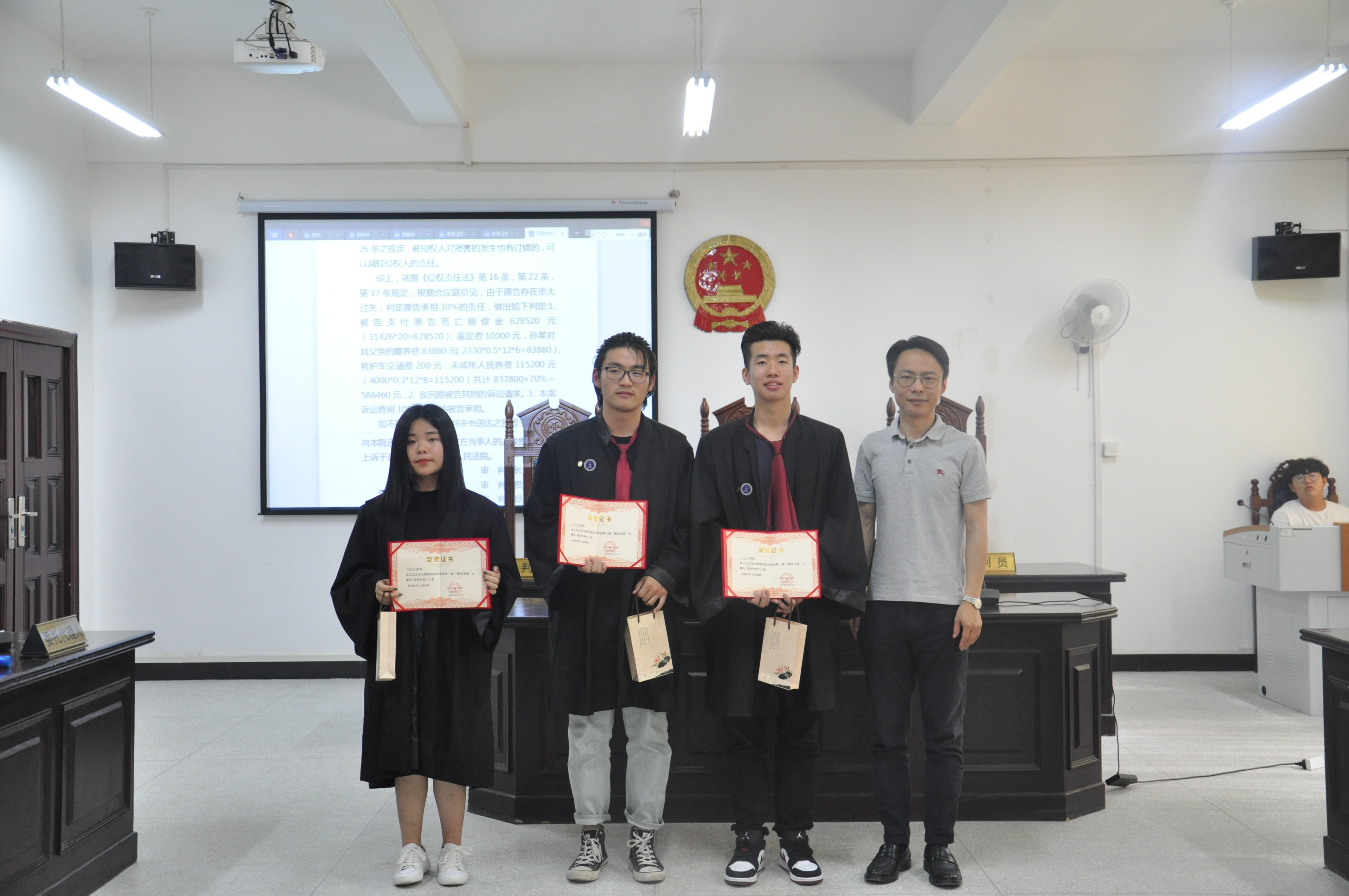 经过评委的评分,由17级法学1班同学担任的法官组在此次模拟法庭大赛中荣获了团体三等奖,由17级法学3班员工担任的原告组在此次模拟法庭大赛中获得了了团体二等奖,一等奖的获得者则是由17级法学二班员工担任的被告组,被告诉讼代理人王冠文、余功成,原告诉讼代理人罗蒙蒙获得个人优秀奖。