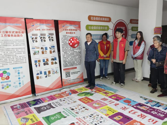 青龙社区的活动现场,一幅巨大的“环保大富翁”游戏布铺在地上,成了全场最热闹的角落。现场气氛热闹非凡,居民们围在游戏布旁,轮流掷起大骰子,根据落点认真思考并回答垃圾分类、环保法规相关问题。答对的居民兴奋地往前跳格子,答错的也会认真倾听志愿者的讲解,及时补充知识。无论是白发苍苍的老人,还是活泼好动的孩子,都在游戏中投入其中,不知不觉就把环保知识记在了心里。