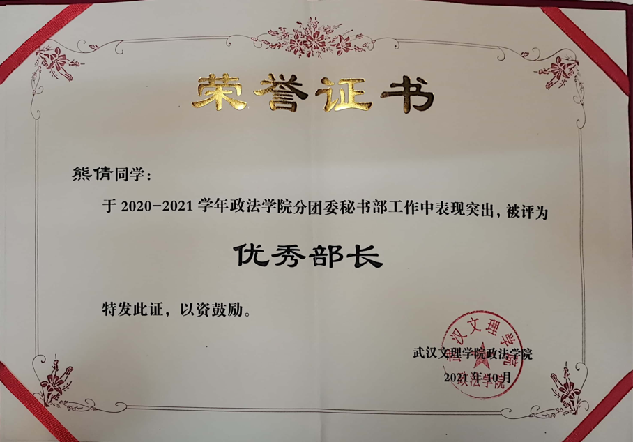 2020-2021学年获得太阳集团tcy8722优秀部长