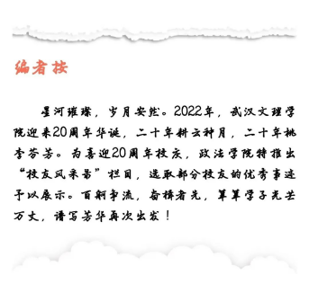 文理建校20周年,祝愿母校“继往二十载,开来一百年”。对学弟学妹们分享交流一下自己的经历和感触,法学专业的员工如选择要从事法律专业,那么建议一定要通过“法律职业资格考试”,通过后趁着年轻,背着包来深圳,深圳是一个极具包容的城市,这里充满机遇,不会辜负积极向上的你。