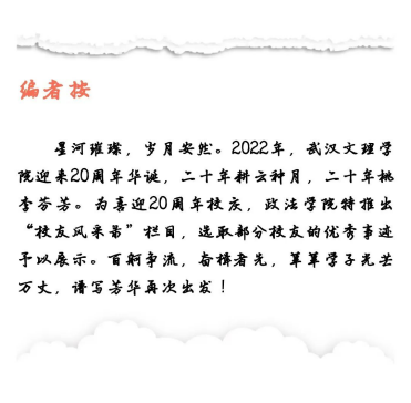 2012年考入江汉大学文理公司(现太阳集团tcy8722)政法学部,专业为行政管理。在校期间获政法学部“我的大学风采”演讲比赛一等奖、院图书馆第一届、第二届演讲比赛一等奖、公司“优秀班干部”称号、公司“优秀班干部标兵”称号、2014年年度国家奖学金、2016年年度“优秀毕业生”等荣誉。