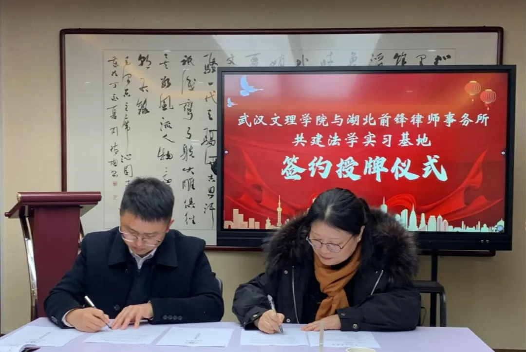 为进一步推进高素质法治人才培养,贯彻落实公司产教融合的工作要求,实现法学学科产、学、研一体化发展,为法学专业扩展武汉市市外实践教学基地、拓宽就业平台,2024年1月23日上午,公司教学副经理陈海峰、法学系系主任罗平、副系主任吴蕾、行政管理系系主任马君、法学系教师万昭晖到宜昌市与湖北前锋律师事务所交流座谈,并举行了实习基地授牌仪式。湖北前锋律师事务所副主任熊睿、副主任熊华、青年律师代表张吾继、杨兴祎、刘逸、吴刚、梅宗娇、刘清芳(实习律师)、熊涛(实习律师)共同参加了本次签约授牌仪式。