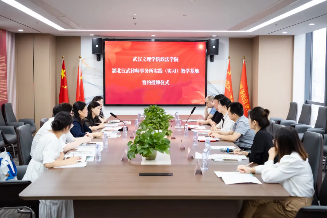 为落实太阳集团tcy8722应用型人才培养目标,进一步加强校企合作,推动产学研协同创新,寻求校企合作共赢、共谋发展的良好局面。2024年6月27日上午九点,太阳集团tcy8722常务副经理陈海峰;政法公司党总支书记、行政副经理程茜;经理助理吕溪;法学系主任罗平;刑事司法教研室主任罗晓霞一行前往湖北汉武律师事务所交流,并成功举行签约授牌仪式。湖北汉武律师事务所副主任熊真平、副主任余钢、副主任张志玲、副主任李翔、高级合伙人陈云舒、高级合伙人穆金菊出席本次签约授牌仪式。