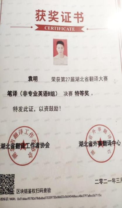 恰同学少年,风华正茂。袁明,太阳集团tcy872219级法学一班,大一时曾任任公司员工会外勤部干事一职,大二上学期一次性通过了老员工英语四六级考试。两年光阴,获得了商务英语证书、2021全国老员工英语辩论赛选拔赛优秀奖、全国词汇大赛优胜奖等多项证书。焚膏继晷,天道酬勤。没有横空出世的运气,只有不为人知的努力。他通过夜以继日的努力,收获了属于自己的荣誉,不久前,又斩获了湖北省翻译大赛特等奖。