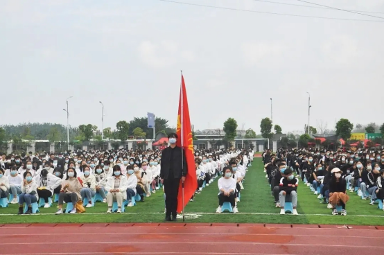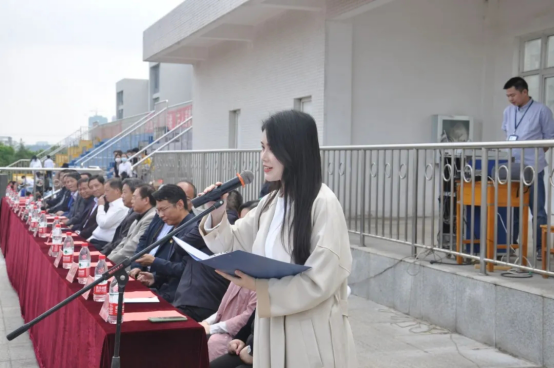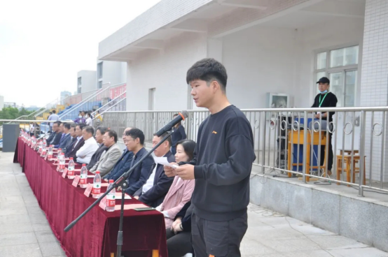 随着国旗护卫队踏着整齐划一的步伐,饱含铿锵有力的气势,迎面走向主席台。随着国歌声响起,体育场上全体师生起立行注目礼。