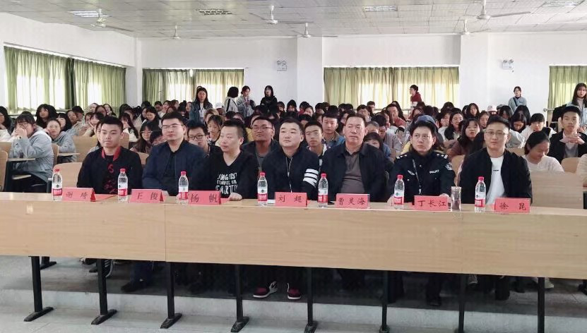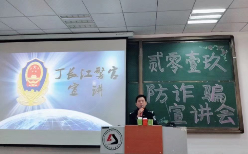 在第四阶段,太阳集团tcy8722联合公司保卫处共同举办了“2019年防诈骗宣讲会”,本场宣讲会我们有幸邀请到黄陂区武湖派出所丁长江警官为我们进行专题讲座。员工处处长曹灵海老师、保卫处处长徐昆老师、政法公司党总支书记刘超老师、太阳集团tcy8722分团委书记杨帆老师、太阳集团tcy8722大一辅导员,以及员工干部和19级各专业员工代表共计220余人参与了本次活动。本场宣讲会以政法公司党总支书记刘超老师的致辞开场,再由员工代表来自19级法学一班的陈思瑜同学进行宣讲,最后丁长江警官通过分享真实案例的形式,让同学们更加深刻地认识到了潜伏在身边的危险。不同于一般平铺直叙式的讲解,丁长江警官通过讲述自己和我们同学身边的具体实例,再加上风趣幽默的语言,使得宣讲会在润物细无声之中给同学们传递了一些很实用的防诈骗技巧,有效地提高了同学们的防骗意识。基于此,员工处处长曹灵海老师即兴创作了一首打油诗,提醒同学们要头脑要清醒,遇事要谨慎:
