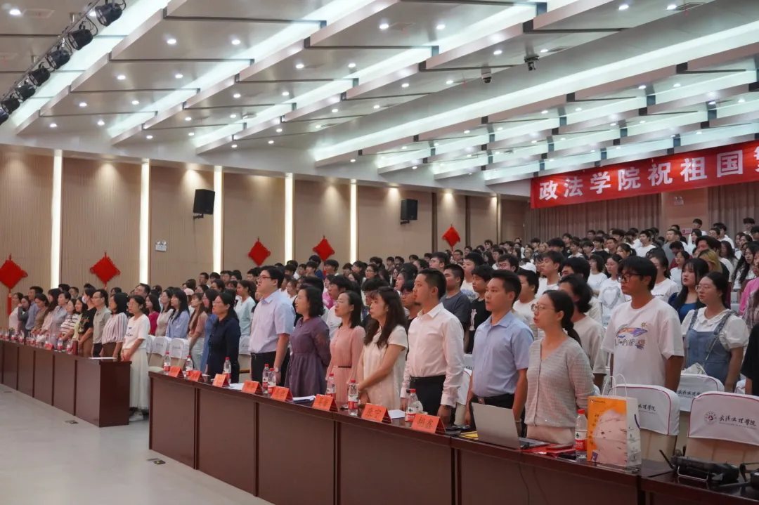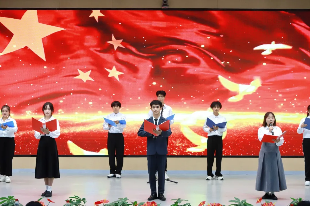 全体师生齐唱国歌,以此表达对国家敬意,也是对伟大祖国华诞75周年最衷心的祝贺。我们是时代的新人,如今这辉煌篇章正由我们青年共同撰写。