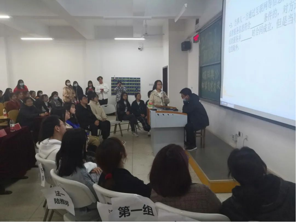 随着老师、比赛选手、以及同学们的入场。比赛也渐渐拉开了帷幕。来观看这次竞赛的老师们可谓是“天团阵容”,有我们的经理李蔚老师,副经理陈海峰老师、曾鹏老师、法学系主任张卫容老师以及各科的任课老师。可谓是来了一场小型的“聚会”。这也体现了老师们对这次决赛的重视与支持。李蔚老师在致词中也表示了自己对民法典的学习体会和对学子们在今后的学习生活的期望。也希望以后有更多这样类似的比赛来激发同学们的热情。