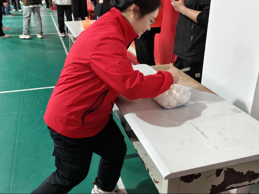 “筷子夹球”的氛围格外紧张又有趣。老师们手持长筷子,将光滑的乒乓球从一个碗夹到另一个碗中。老师们屏息凝神,筷子稳夹乒乓球稳步移动,专注的神情里满是不服输的劲头,小小的乒乓球,成为了连接快乐与挑战的纽带。