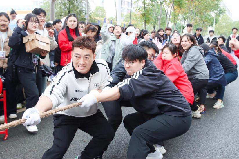 紧接着,教职工们来到了拔河赛场。两支队列紧握长绳,身体后倾、重心下沉,随着裁判哨声响起,双方瞬间发力,绳子中间的红线左右移动。场边师生组成的啦啦队,加油声一波高过一波,每一次绳子的轻微移动,都能引发全场欢呼,团队的凝聚力在这一刻被彻底点燃。