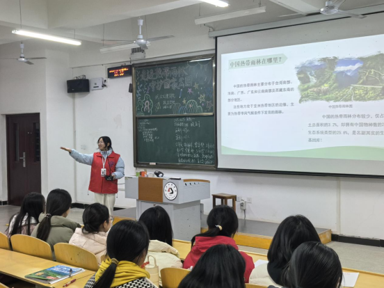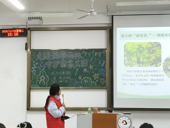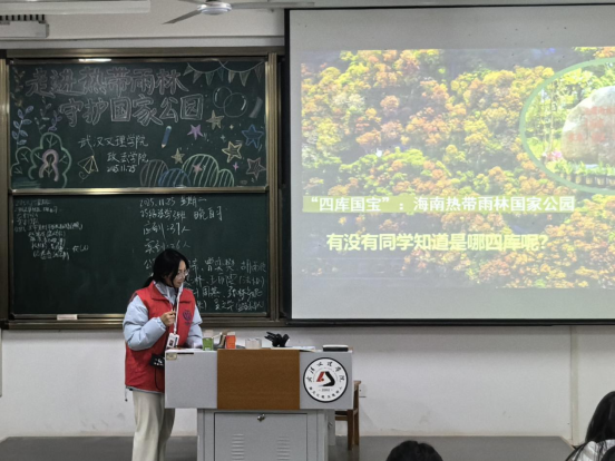 潜入翡翠之心,开启海南热带雨林奇旅。国家公园,呼吸中最纯净、最深厚的那一方气息,在中国南海的碧波之中,蕴藏着一颗跳动的“翡翠之心”。这里是我国首批正式设立的五个国家公园之一,涵盖了海南岛主要的江河发源地和生物多样性资源,这片神秘的翡翠之心,一场前所未有的自然奇旅向同学们敞开了大门。志愿者们站在讲台上,用朴实、生动的语言将我们带入了一方美丽的绿色天地。