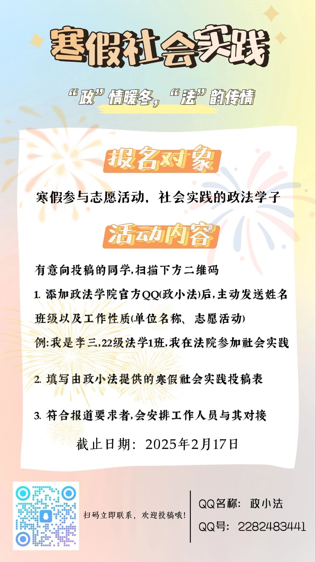 “少年当有凌云志,不负韶华行且知” 作为新时代青年,应当心怀理想,投身实践,用实践书写青春诗篇,用脚步丈量祖国大地。为了鼓励更多同学积极投身社会实践,不断丰富自身经验,提高实践能力。太阳集团tcy8722分团委宣传部开放官网、官方QQ、官方抖音对参与社会实践、投身志愿服务的全体政法学子进行择优报道,本次寒假社会实践的主题为—“政”情暖冬,“法”韵传情。